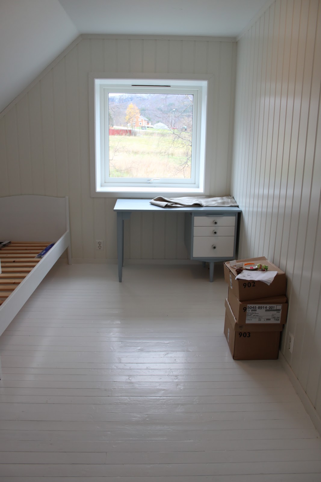 Vi holder på å legge 70 kvm med nye tregulv i 1.etasjen av huset, og har nå lagt ferdig på soverommet og halve stua... :) Når vi er ferdige skal vi male det hvitt eller lysegrått...